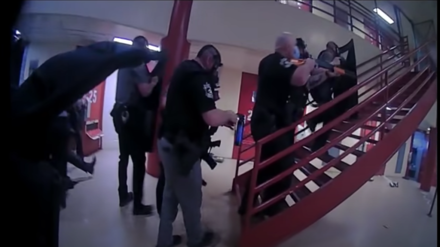 The graphic video also shows police and sheriff’s deputies enter the pod at the Oklahoma County Detention Center and shoot and kill 34-year-old inmate Curtis Montrell Williams, who was standing at the top of a landing and holding a knife to the neck of jailer Daniel Misquez, who was on his knees. After Williams was shot, Misquez tumbled down the staircase and officers pulled him to safety and left the pod. Misquez was treated at a hospital for injuries that weren’t life-threatening, jail officials said.