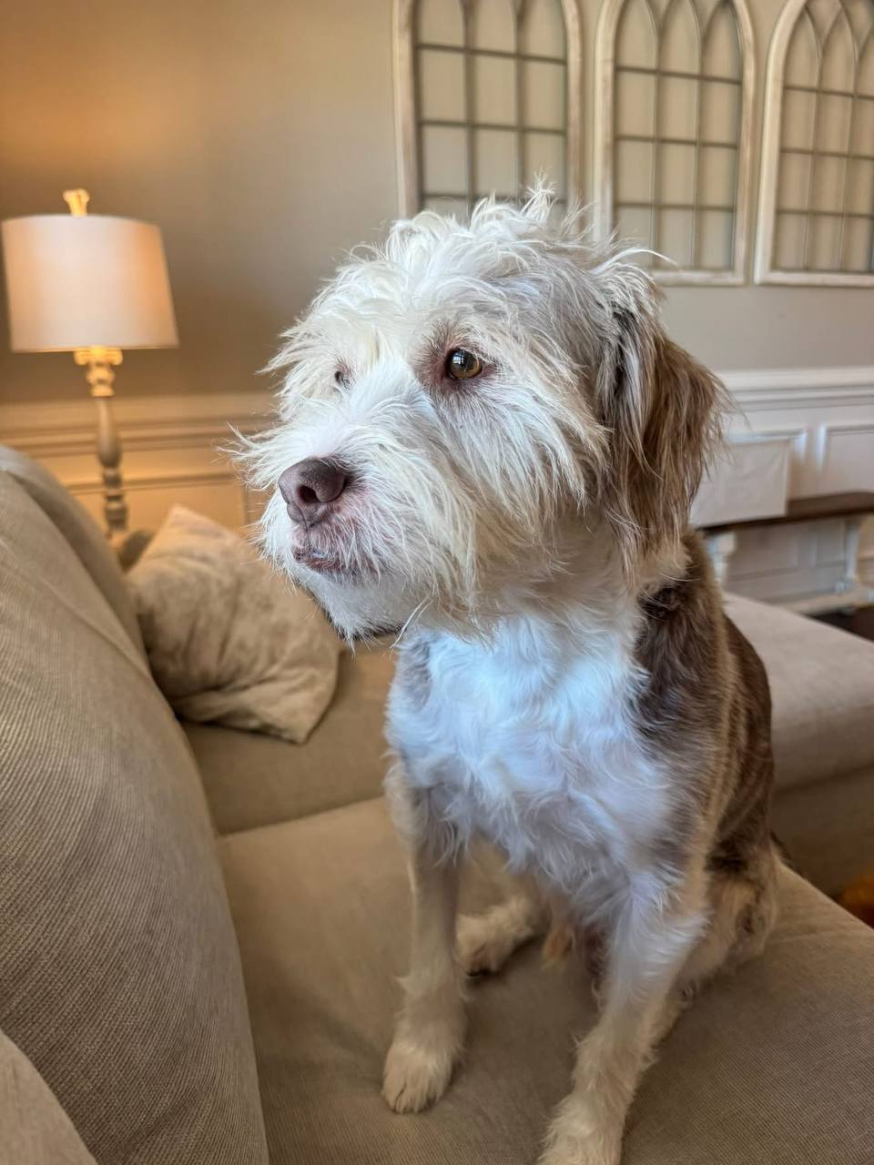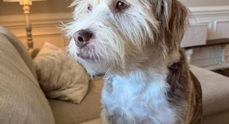 There is a quiet sadness in this picture that doesn’t need words to be understood. The dog stands still on the couch, small and fragile against the soft, warm background of the room, yet somehow feeling very alone. The light in the room is gentle, but it cannot fully reach the expression in those eyes—eyes that seem to be waiting, hoping, remembering. There is no movement, no excitement, just a calm stillness that feels heavy, as if time itself has slowed down for this moment.